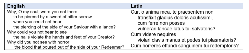 Why, O my soul, were you not there / to be pierced by a sword of bitter sorrow / when you could not bear / the piercing of the side of your Saviour with a lance? / Why could you not bear to see / the nails violate the hands and feet of your Creator? / Why did you not see with horror / the blood that poured out of the side of your Redeemer? 6