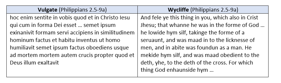- Vincent Gillespie and Maggie Ross, “The Apophatic Image: The Poetics of Effacement in Julian of Norwich,” pages 59-60. I have followed the example of Professor Gillespie and Maggie Ross in using the Douay-Rheims translation, which is a translation of the Vulgate. Below are the Vulgate and the Wycliffe translations of the same passage, Philippians (2.5-9a).