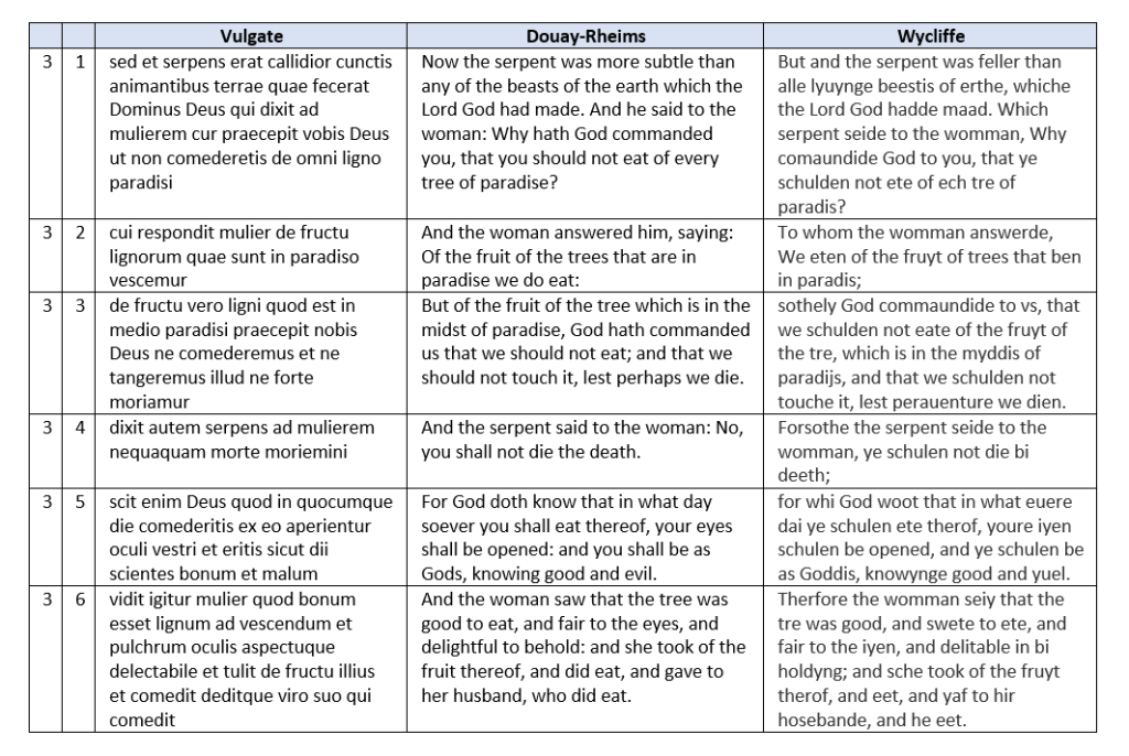 - Emphasis Mine. Table One below provides the Latin Vulgate, English Douay-Rheims, and the Middle English Wycliffe Bible translations of Genesis 3:1-6.