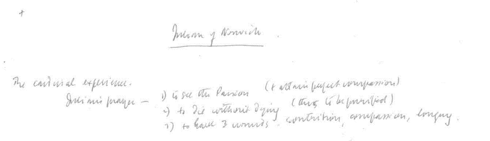 - “Which creature desired before thre giftes by the grace of God. The first was mind of the passion. The secund was bodily sicknes. The thurde was to have of Godes gifte thre woundes …. the wound of very contrition, the wound of kind compassion, and wound of wilful longing to God.” (Julian of Norwich, The Writings of Julian of Norwich, Eds, Nicholas Watson and Jacqueline Jenkins. University Park, The Pennsylvania State University Press, Chapter 2, lines 2-4 and 34-35, pages 125 and 129.) Image One below is of TM’s apparent notes on Chapter 2 of Julian’s text. I am deeply grateful to Dr. Paul Pearson, Director of the Bellarmine University’s Thomas Merton Center in Louisville, Kentucky, for making available a scan of these Notes. While a bit challenging to decipher, TM’s summary of the first of Julian’s requested “gifts” is helpfully succinct: “to see the Passion.” The parenthesized words next to this note would seem to be: “+ attain perfect compassion.”