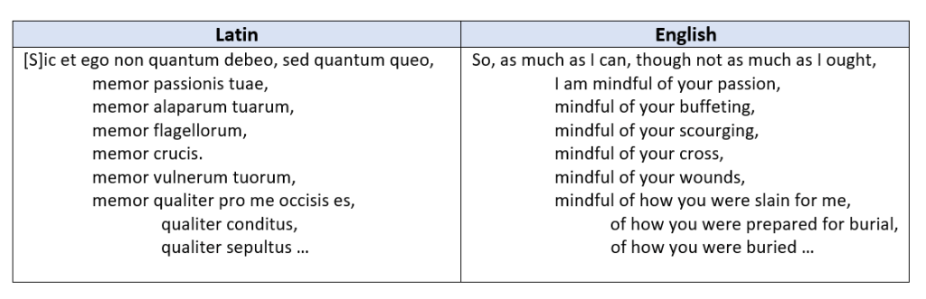 So, as much as I can, though not as much as I ought, / I am mindful of your passion, / mindful of your buffeting, / mindful of your scourging, / mindful of your cross, / mindful of your wounds, / mindful of how you were slain for me, / of how you were prepared for burial, / of how you were buried … 5