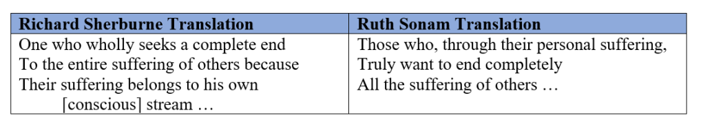 Regarding Father Sherburne’s translation itself, Professor Cabezón affirms that it is “certainly a welcome addition to the field of Buddhist studies” and that it is “on the whole quite accurate and readable.” However, the professor identifies “a few points” of concern, one of which involves the Jesuit’s translation of Verse 5 of the Lamp, where Atisa describes the qualities and actions of a “superior” being, a Bodhisattva. 3 Father Sherburne’s translation reads: “One who wholly seeks a complete end / To the suffering of others because / Their suffering belongs to his own (conscious) stream …” 4 Expressing his concern about the priest’s wording, the professor writes: