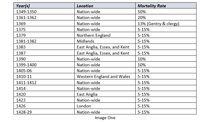 - Robert S. Gottfried, The Black Death: Natural and Human Disaster in Medieval Europe. New York: Free Press, 1983, pages 130. Table One below gathers Professor Gottfried’s data so as to provide an outline of plague devastation in England during Julian’s lifetime.
