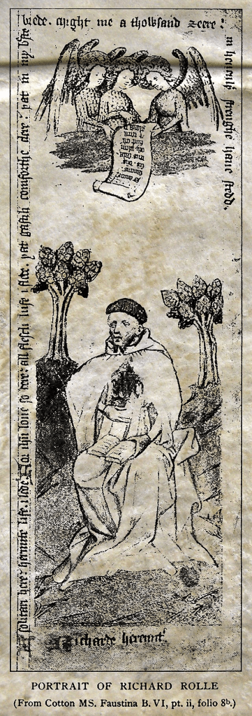 - “Introduction,” Richard Rolle: The English Writings. Translated, edited, and introduced by Rosamund S. Allen. New York: Paulist Press, 1988 pages 179-180. See below for an image of a seated Richard Rolle, dating from the 1400’s. Retrieved from: File:Rolle Richard.jpg – Wikimedia Commons