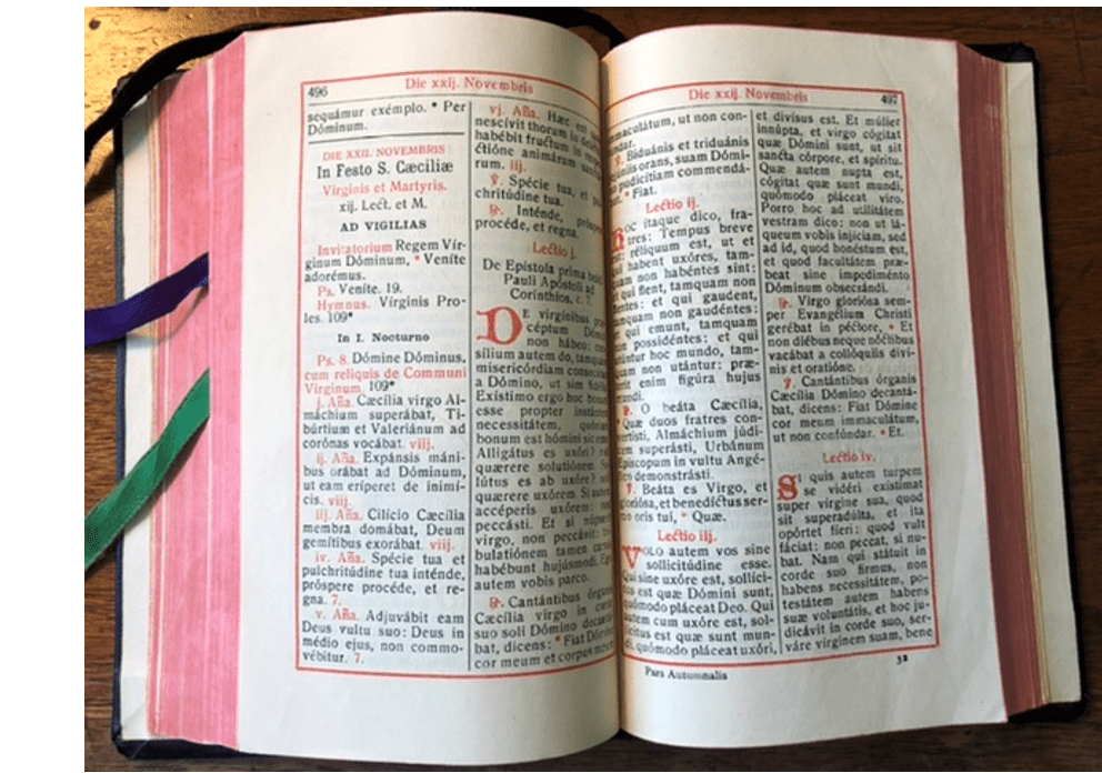 - In a journal entry, dated “November 22, 1968. Darjeeling,” on the Feast of Saint Cecilia the Martyr, TM writes: “In his preface to a book on the Abbe [Jules] Monchanin, a Frenchman who became a hermit on the banks of the sacred river Cauvery in South India, Pierre Emmanuel writes of vocation: ‘What is a vocation? A call and a response. This definition does not say everything: to conceive the call of God as an expressed order to carry out a task certainly is not always false, but it only true after a long interior struggle in which it becomes obvious that no such constraint is apparent. It also happens that the order comes to maturity along with the one who must carry it out and that it becomes in some way this very being, who has now arrived at full maturity. Finally, the process of maturing can be a mysterious way of dying, provided that with death the task begins …. There has to be a dizzying choice, a definite dehiscence (rupture) by which the certitude he has gained of being called is torn asunder. That which – as one says, and the word is rightly used here – consecrates a vocation and raises it to the height of the sacrifice which it becomes is a breaking with the apparent order of being, which its formal full development or its visible efficacy.” (Thomas Merton, The Other Side of the Mountain: The End of the Journey, The Journals of Thomas Merton: Volume Seven 1967-1968. Edited by Patrick Hart, O.C.S.O. New York: HarperCollins Publishers, 1998, page 296. The Pierre Emmanuel quotation appears in TM’s journal in French, which the editors of his journal kindly translate.) See below a photo of the first pages of the Feast of Saint Cecilia from the Cistercian Breviary. (Breviarum Cisterciense, Pars Autumnalis. Westmalle, Belgium: Typis Cisterciensibus, 1951, pages 496-497).