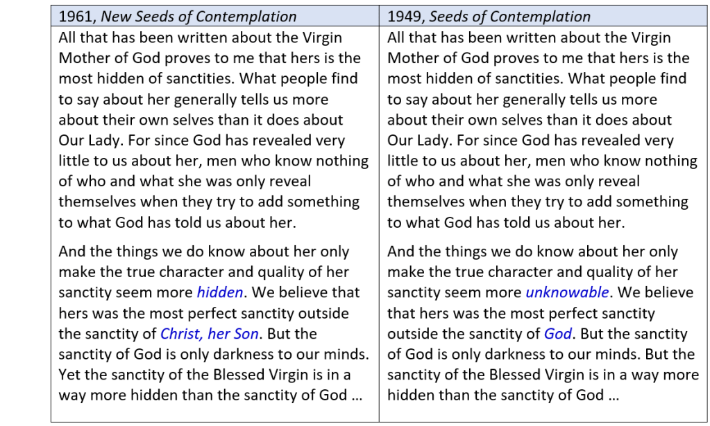 - Emphasis mine. I am grateful to Kenneth M. Voiles for highlighting this passage in his article, “The Mother of All the Living: The Role of the Virgin Mary in the Spirituality of Thomas Merton,” Spiritual Life, 36.4 (Winter 1990), pages 217-228. Directly following this note is a comparison of the two versions with the modest revisions highlighted in blue ink. The 1961 version appears at the beginning of Chapter 23, “The Woman Clothed with the Sun.” See Thomas Merton, New Seeds of Contemplation, New York: New Directions Books, 1961, page 167. The 1949 passage appears toward the end of Chapter 13, “Through the Glass.” See Thomas Merton, Seeds of Contemplation, Norfolk, CT: New Directions Books, 1949, page 100.
