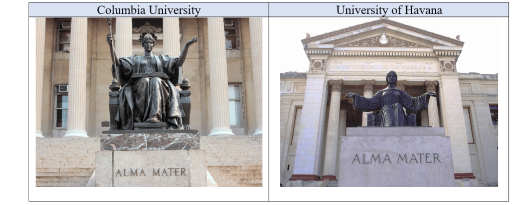 - “almus,” Dictionary of Medieval Latin from British Sources: https://logeion.uchicago.edu/almus. Below are side-by-side images of the Alma Mater statues at Columbia University and the University of Havana. The photo of the Columbia statue was retrieved from Wikimedia Commons: File:2014 Columbia University Alma Mater closeup.jpg – Wikimedia Commons And that of the University of Havana was taken from the Wikipedia article about that university: https://en.wikipedia.org/wiki/University_of_Havana